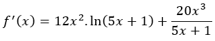 Utilizando a Regra da Cadeia e a Regra do Produto, calcule a primeira derivada da função f(x) = 4x³ . ln(5x+1).