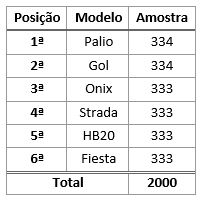 Vamos admitir que faremos uma pesquisa de amostra igual a 2000 indivíduos. Qual será a quantidade de pessoas proprietárias de cada um dos modelos listados que devemos entrevistar de maneira intencional? Basta calcularmos as quantidades correspondentes a cada um dos modelos baseado na porcentagem populacional: