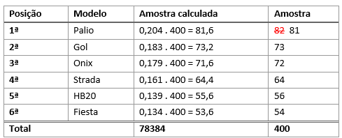 Muito utilizada quando a escolha da amostra for desproporcional à população. De modo geral, este método de amostragem só deve ser realizado quando não se conhece o tamanho real da população correspondente a cada categoria analisada. Por exemplo, considere a tabela anterior a respeito dos 6 veículos mais vendidos no Brasil no mês de julho de 2014. Caso não tivéssemos acesso às porcentagens populacionais, poderíamos realizar uma pesquisa com 2000 pessoas da seguinte maneira: